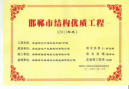 2013年度邯郸市结构优质工程(阿尔卡迪亚蓝天城14#楼)
